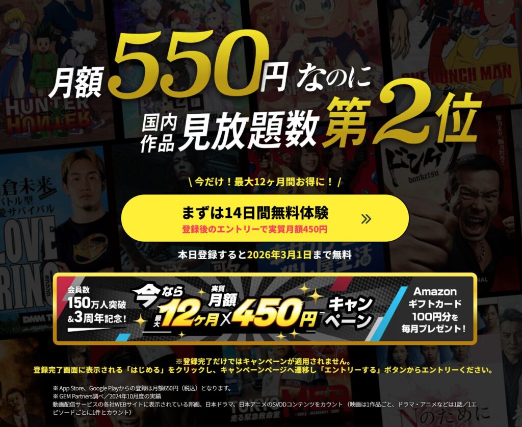 新規登録するだけ無料トライアル14日間と、すぐに使える550円分のDMMポイントが貰えます。